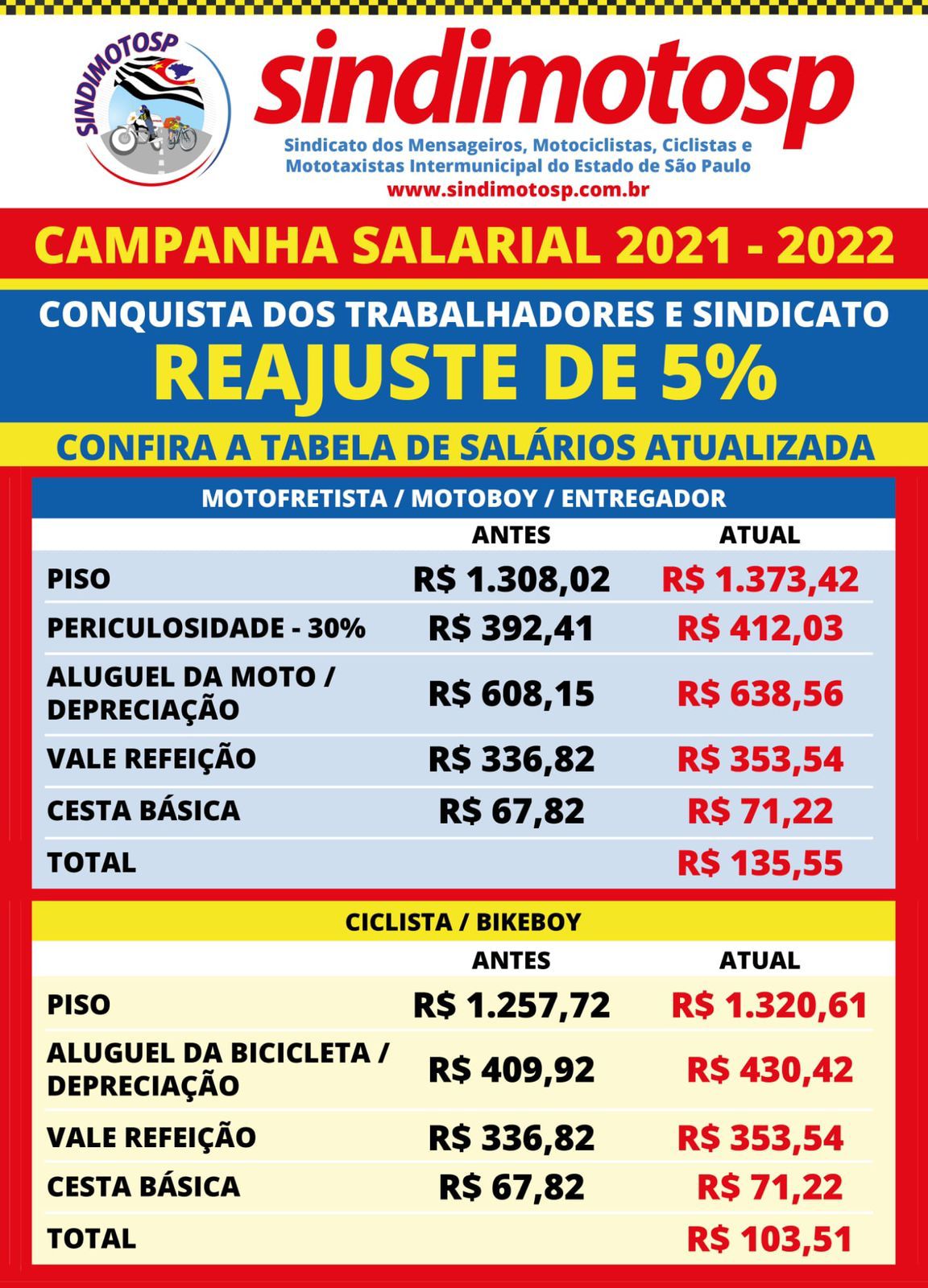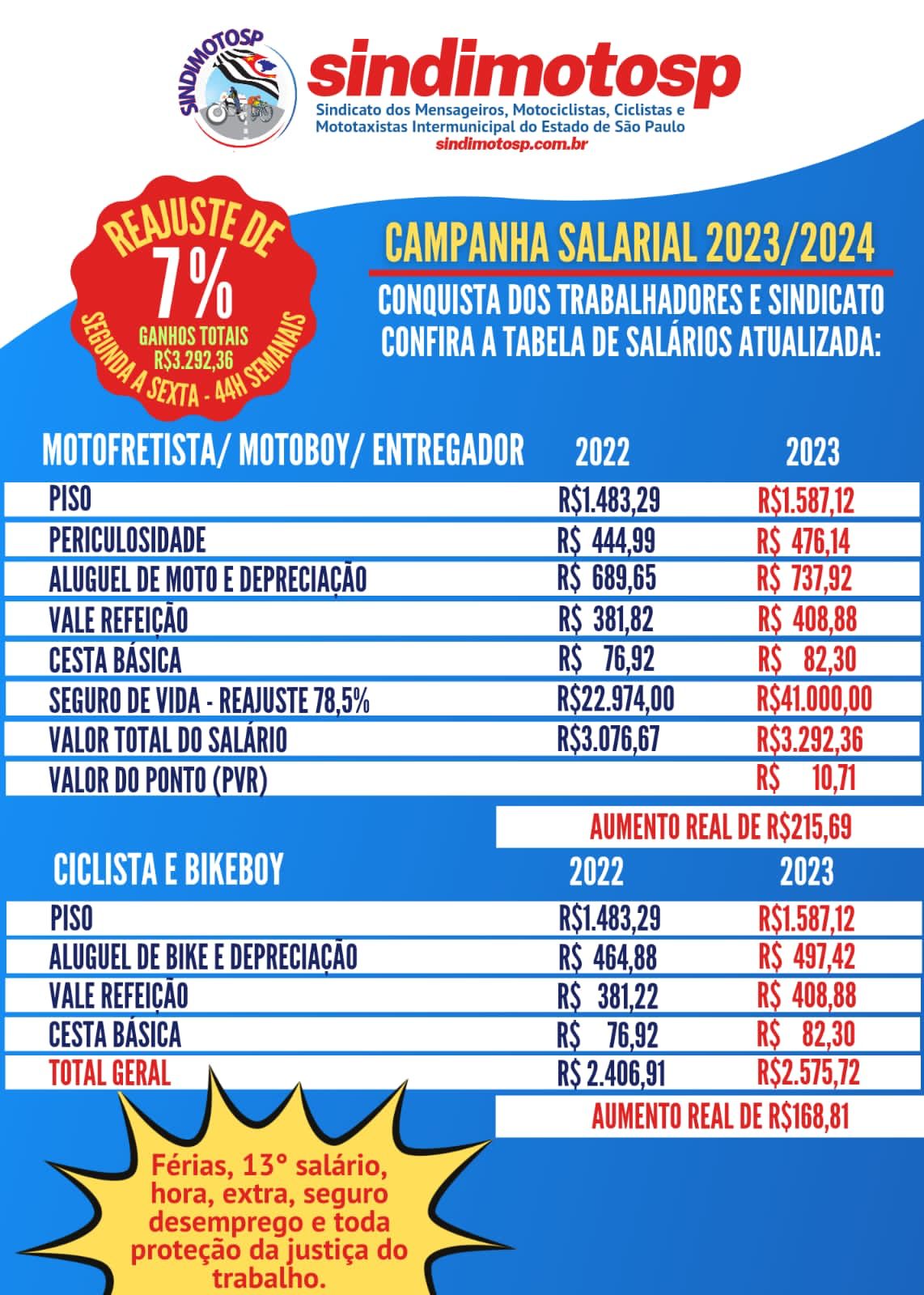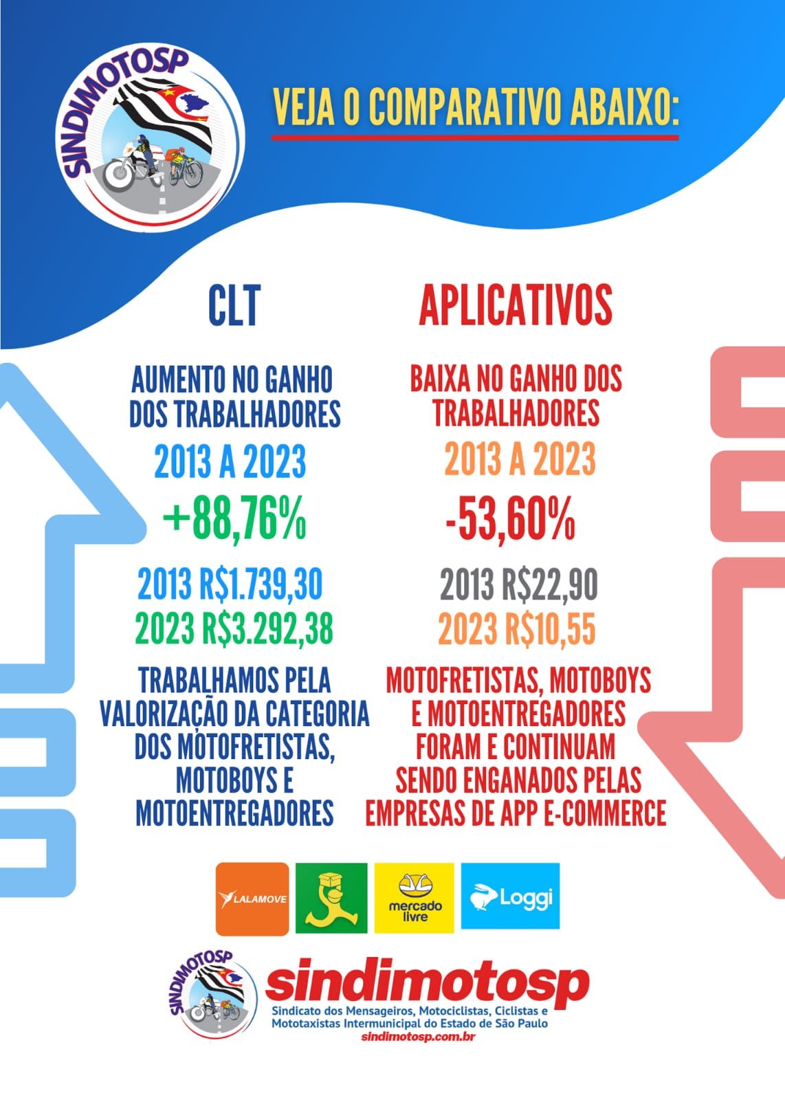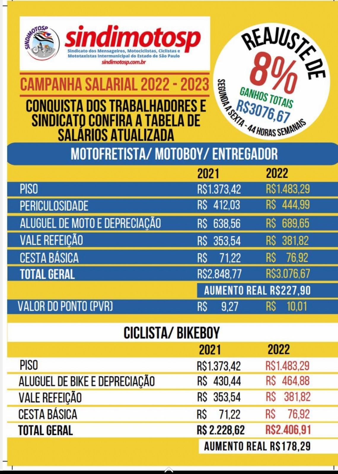 Apesar dessa precarização sem tamanho, o SindimotoSP assim como outros sindicatos de motofrete de todo Brasil, tem conseguido reajustes reais para os trabalhadores CLT e mantido seus direitos trabalhistas.