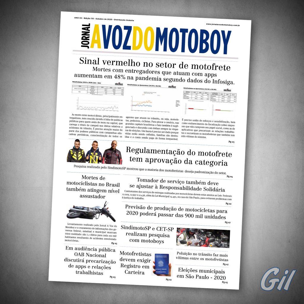 O informativo da categoria lança essa semana a sua nova edição. “A Voz do Motoboy 116” destaca na manchete o grande aumento das mortes de entregadores que trabalham com apps durante a pandemia. São oito páginas recheadas de notícias de extrema importância para os Motociclistas de toda cidade. Vale a pena conferir e compartilhar com os colegas. Você não precisa esperar chegar a versão impressa. Pode ler pelo PDF agora mesmo!