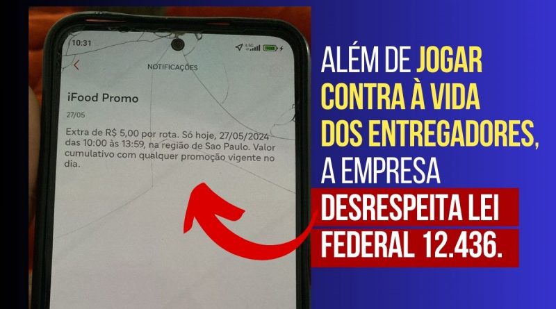 Essa atitude de premiar entrega, além de irresponsável e atentar contra à vida dos entregadores é uma clara afronta a Lei Federal Lei 12.436, que veda o emprego de práticas que estimulem o aumento de velocidade por motociclistas profissionais, como oferecer prêmios por cumprimento de metas por números de entregas e estabelecer competição entre motociclistas, com o objetivo de elevar o número de prestação de serviço.