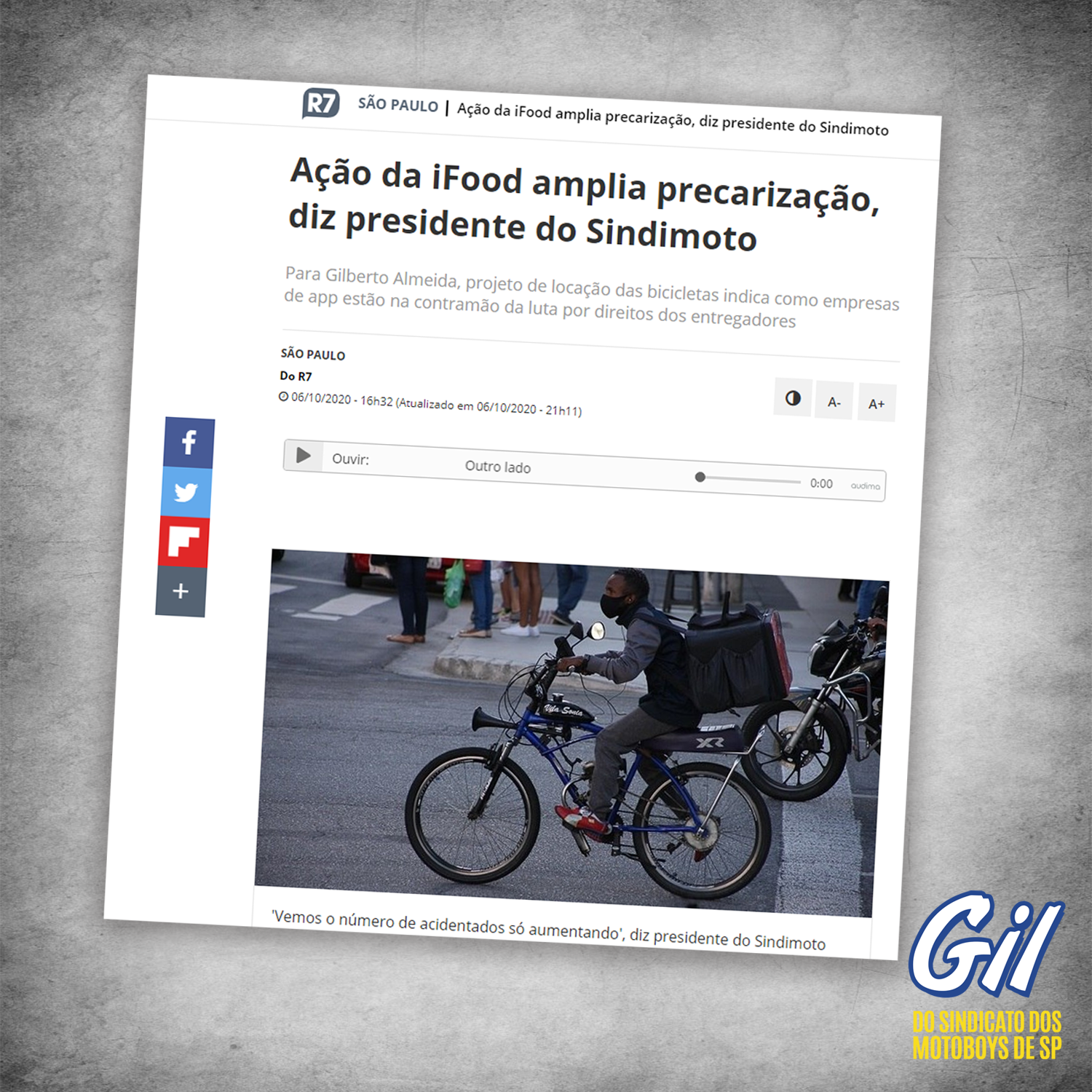 O iFood, mais uma vez, realizou este mês uma ação que, na prática, trata-se de mais um empurrão para a precarização do trabalho de entregas em São Paulo. Eles inauguraram uma bicicletaria para ALUGAR os equipamentos para os Entregadores trabalharem. A equipe do site R7 me procurou para uma entrevista, a qual agradeço a oportunidade de poder expressar a opinião do Sindicato dos Motoboys (SindimotoSP).