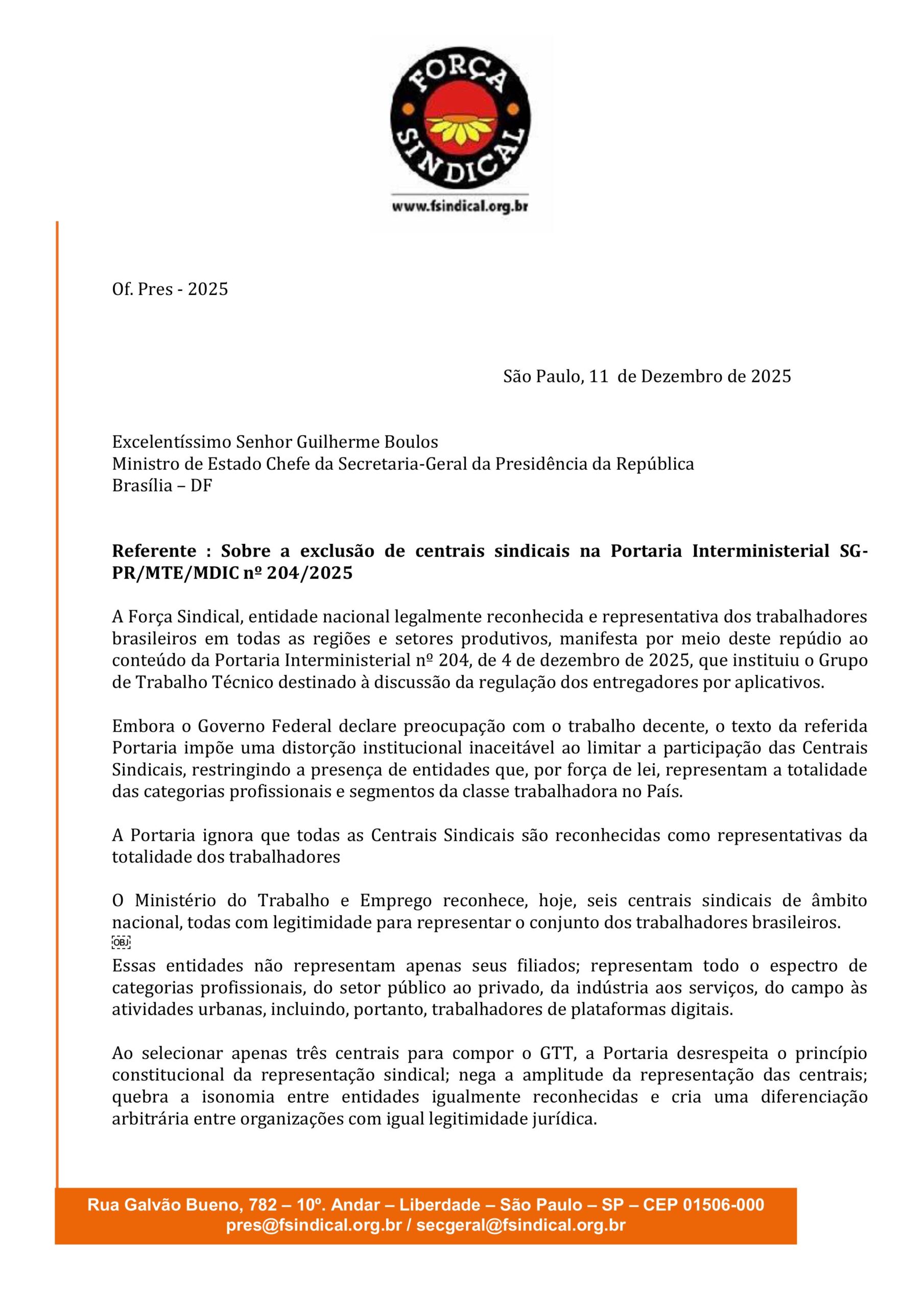 brasileiros em todas as regiões e setores produtivos, também manifestou repúdio à Portaria Interministerial nº 204, de 4 de dezembro de 2025, do Ministro Guilherme Boulos, que instituiu o Grupo de Trabalho Técnico destinado à discussão da regulação dos entregadores por aplicativos.