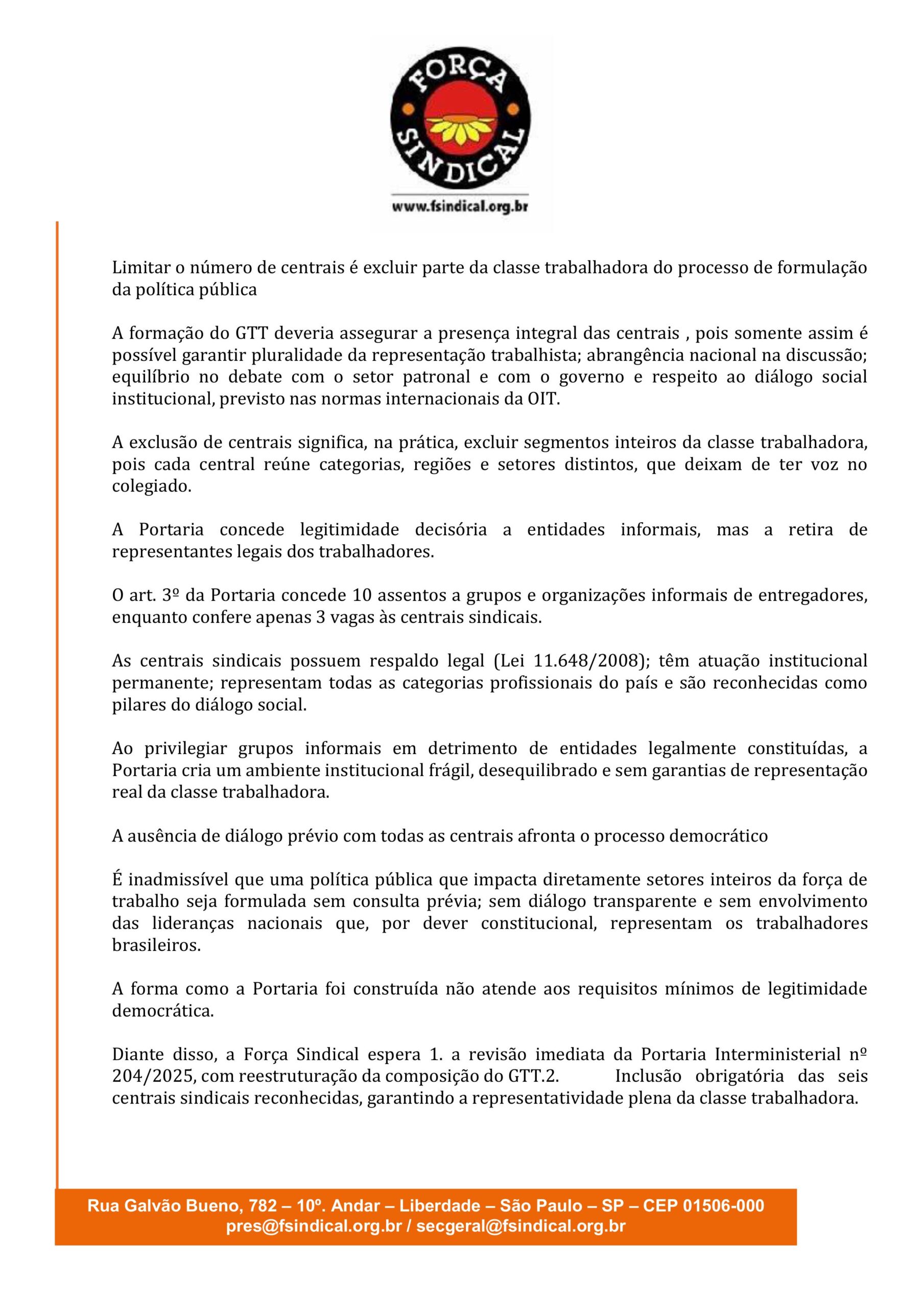 Por isso, a Força Sindical espera a revisão imediata da Portaria Interministerial nº 204/2025, com reestruturação da composição do GTT, a inclusão obrigatória das seis centrais sindicais reconhecidas, garantindo a representatividade plena da classe trabalhadora; prioridade para entidades sindicais legalmente constituídas nas vagas destinadas aos trabalhadores e suspensão dos efeitos da atual composição até a correção das distorções.
