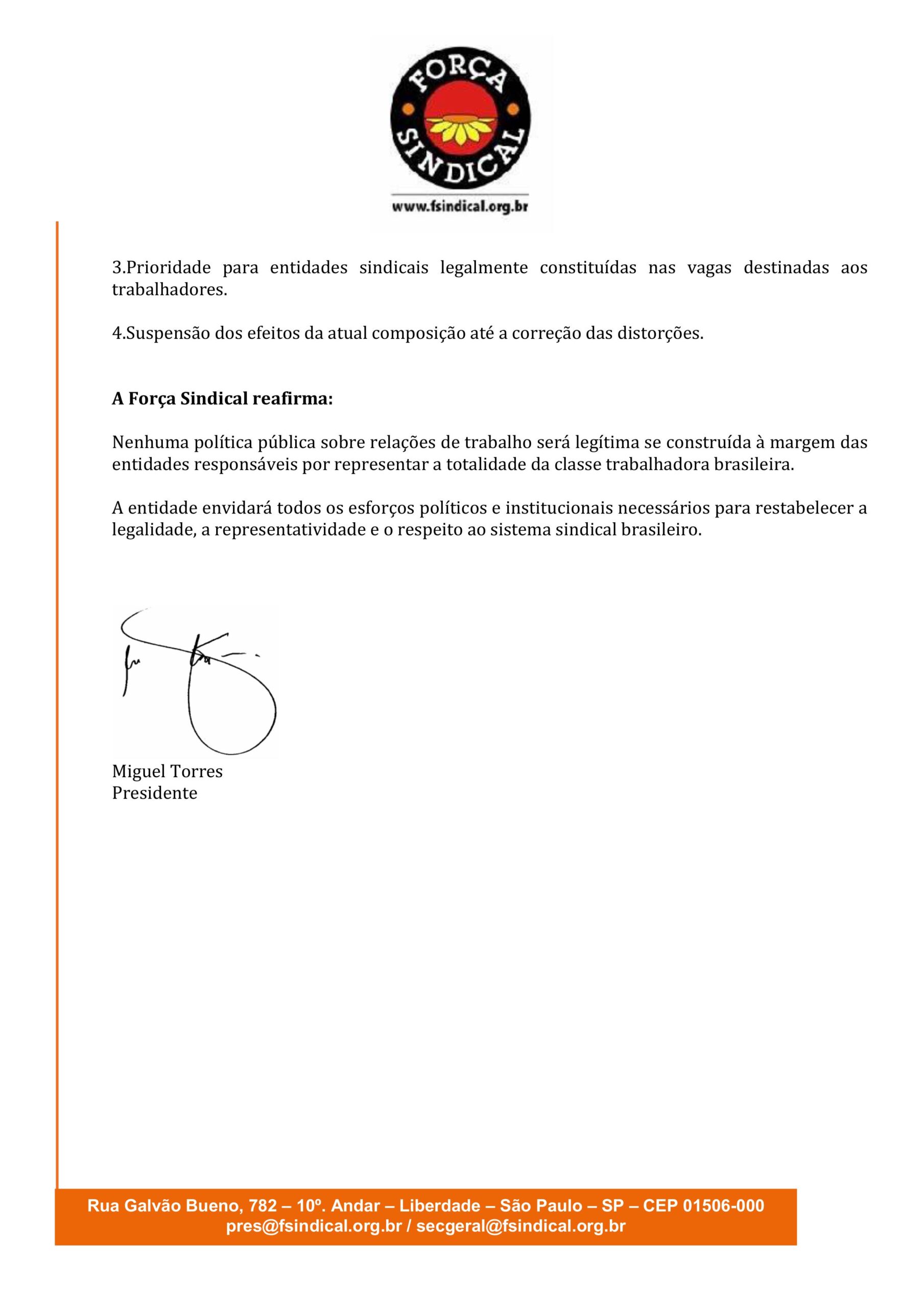 A Força Sindical, entidade nacional legalmente reconhecida e representativa dos trabalhadores