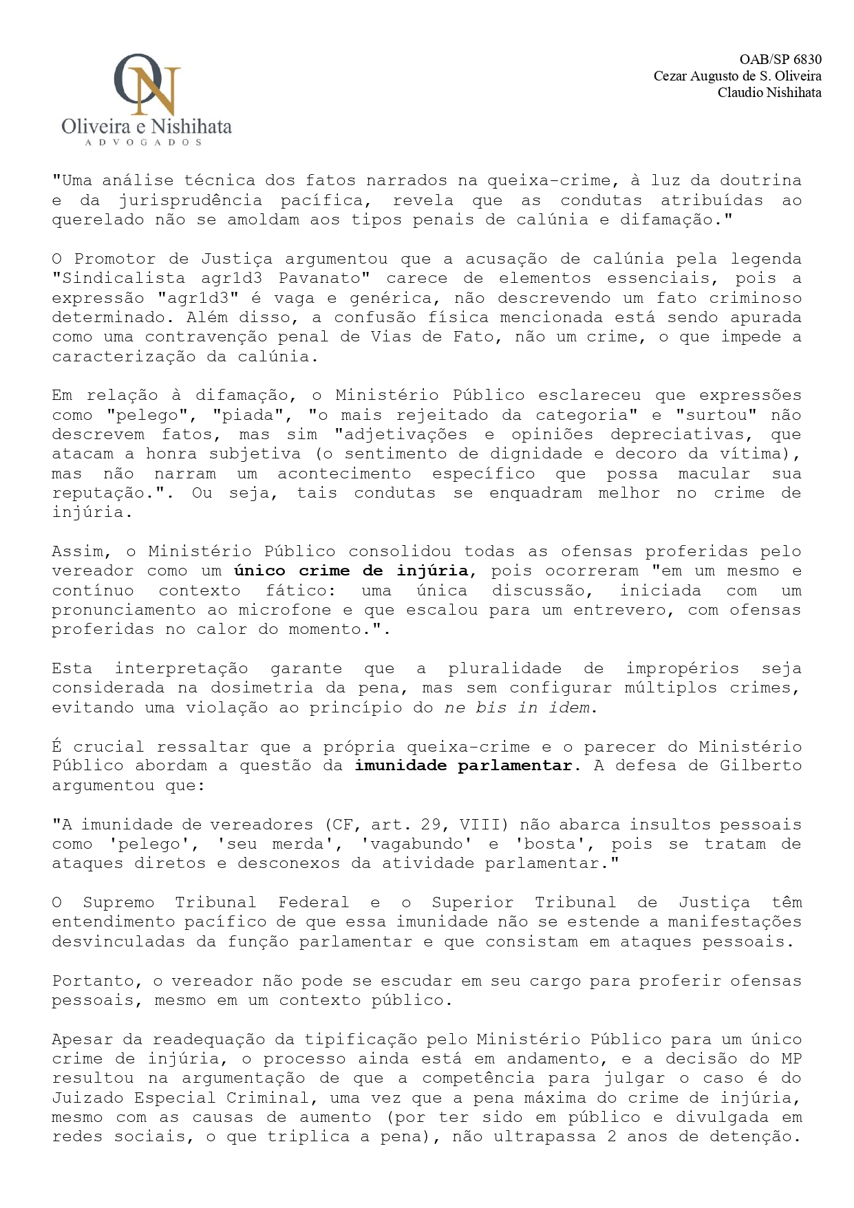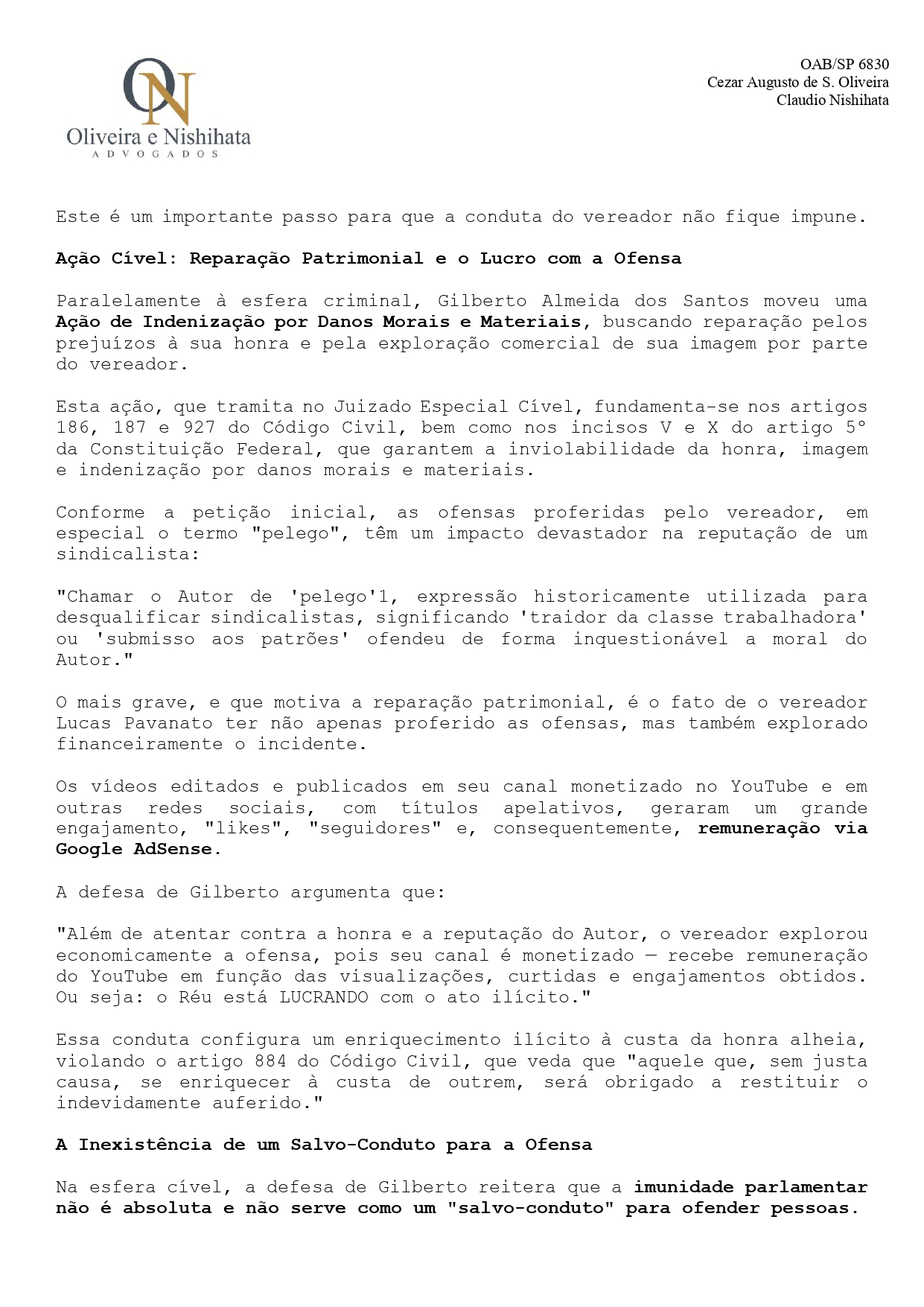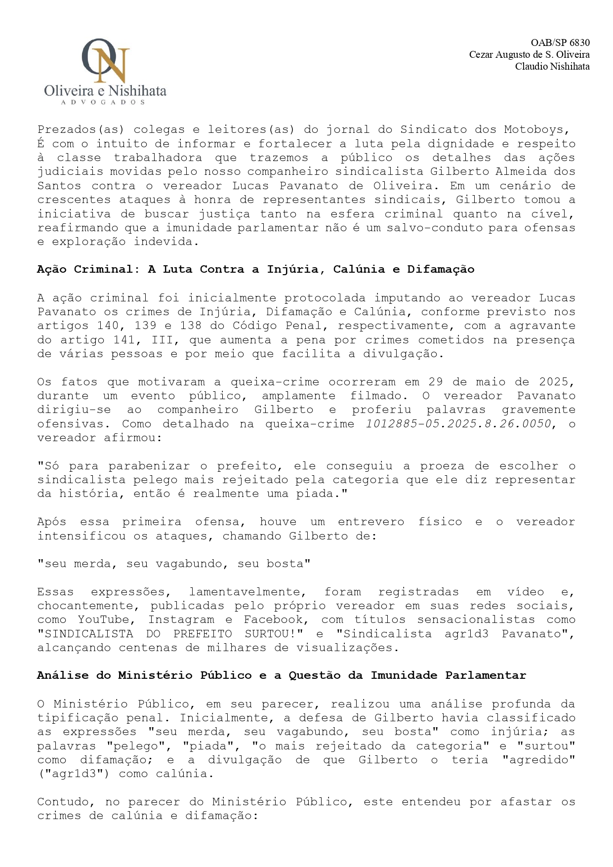 Após sofrer ataques contra sua honra e história – como um dos sindicalistas mais atuantes do setor de motofrete no Brasil – Gilberto Almeida dos Santos, o Gil, entrou na justiça com uma ação criminal imputando ao vereador Lucas Pavanato os crimes de Injúria, Difamação e Calúnia, conforme previsto nos artigos 140, 139 e 138 do Código Penal, respectivamente, com a agravante do artigo 141, III, que aumenta a pena por crimes cometidos na presença de várias pessoas e por meio que facilita a divulgação.