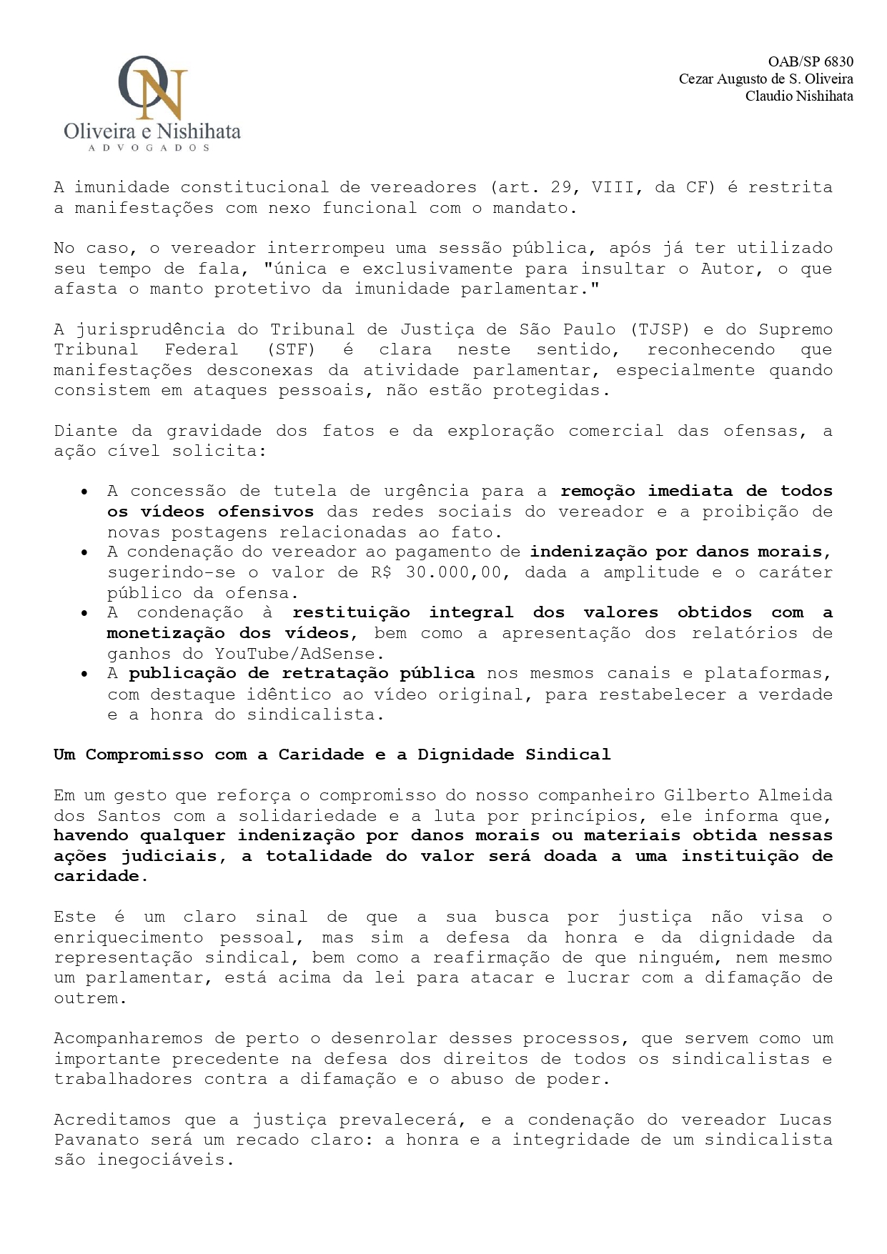 O presidente Gil pede justiça e reparação pelas ofensas e ressalta que, havendo qualquer indenização por danos morais ou materiais obtida nessas ações judiciais, a totalidade do valor será doada a uma instituição de caridade.