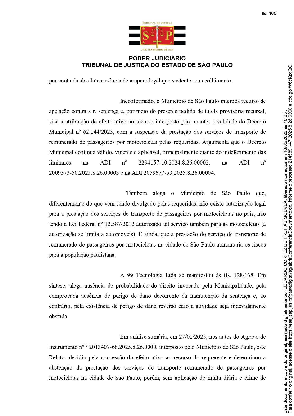 O Tribunal de Justiça de SP, através do relator Juiz Eduardo Gouveia, na decisão do Processo nº 2145891-47.2025.8.26.0000 – Órgão Julgador: 7ª Câmara de Direito Público, acaba de reconhecer que o Decreto Municipal nº 62.144/2023, não proíbe de forma definitiva o mototáxi e suspende assim decisão que liberou o serviço de transporte de passageiro, que continua proibido na capital.