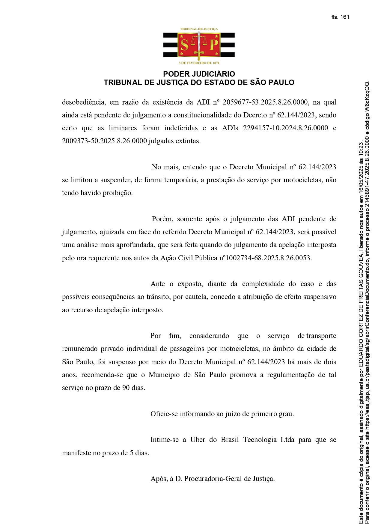 Diante da complexidade jurídica e dos potenciais impactos ao trânsito e à segurança pública, o relator optou por atribuir efeito suspensivo ao recurso de apelação, ou seja, determinou que a suspensão do serviço continue válida até a decisão final da apelação.