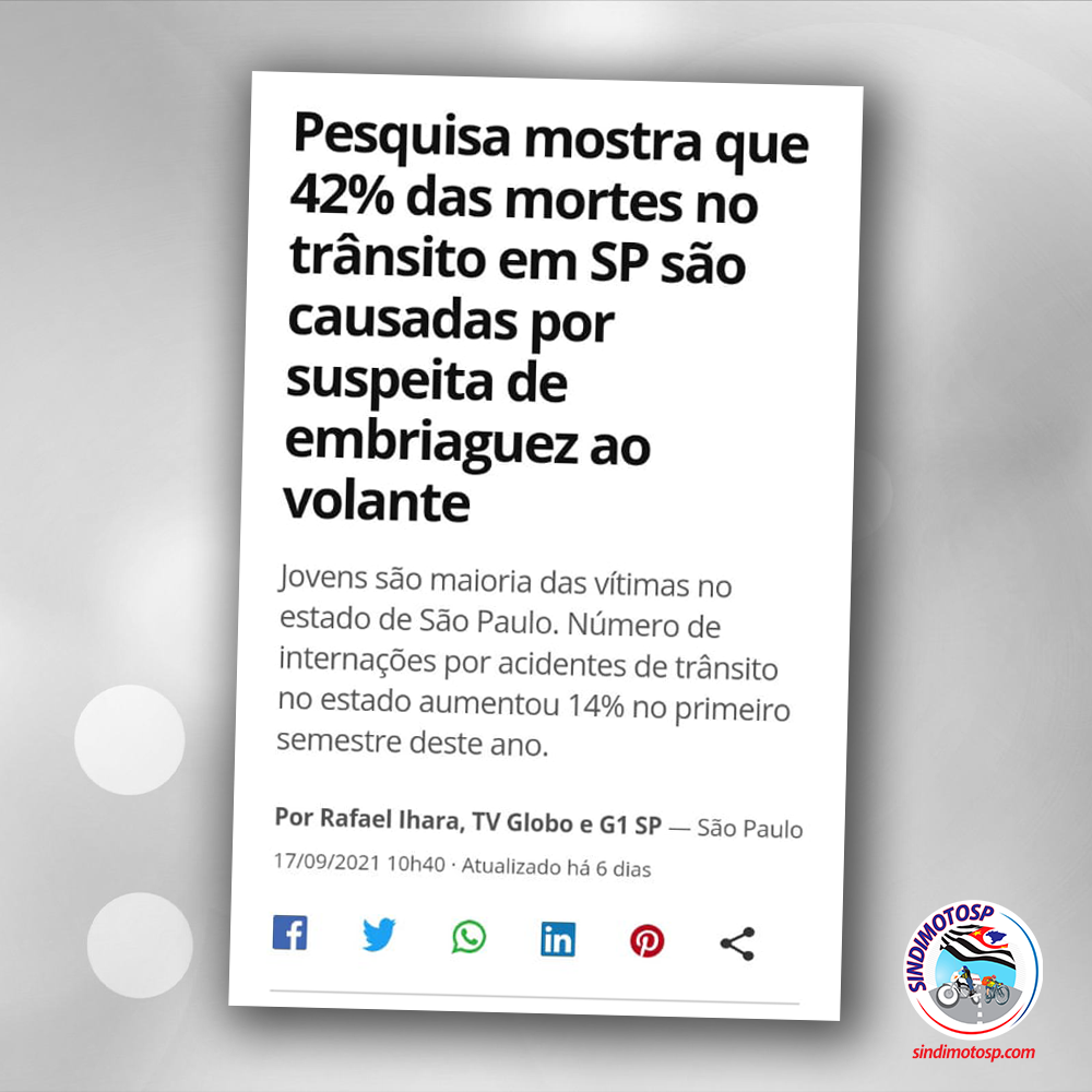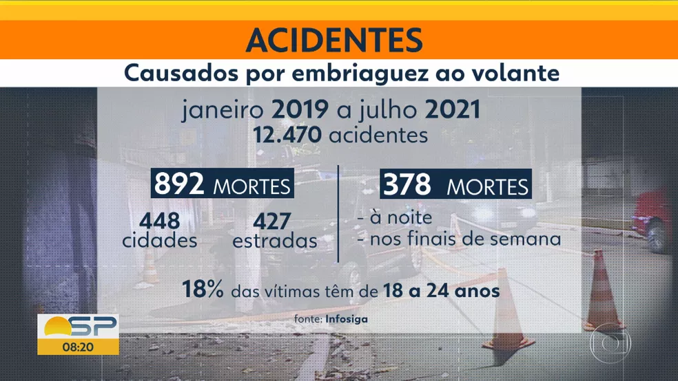 Levantamento feito pelo DetranSP (Departamento Estadual de Trânsito de São Paulo) e o Infosiga (Informações Gerenciais de Acidentes de Trânsito do Estado de São Paulo) aponta um dado alarmante: 42% das mortes no trânsito são por suspeita de embriaguez ao volante. De janeiro de 2019 a julho de 2021, foram registrados 12.470 acidentes e 892 óbitos de motoristas neste cenário. E também é constatado o fato das maiores vítimas serem os jovens.