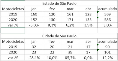 Dados do Infosiga mostraram assustador aumento de mortes de motoboys no local dos acidentes na capital paulista. Em março de 2020 foram 39 óbitos contra 21 no mesmo mês de 2019. Somando todas as ocorrências no estado de São Paulo, também houve crescimento nos números das mortes saltando de 161 (2019) para 171 (2020), resultando aumento de 6,2%.