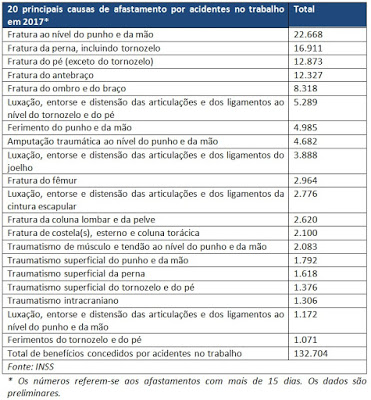O Ministério do Trabalho lembra que a intenção é conscientizar empregadores, trabalhadores e toda a sociedade sobre a necessidade de observar as normas de segurança e saúde no ambiente de trabalho. Os acidentes acontecem, na maioria das vezes, quando as normas de segurança são desrespeitadas. Dos 20 principais tipos de problemas causados por acidentes com afastamento superior a 15 dias em 2017, oito foram fraturas conforme tabela abaixo.