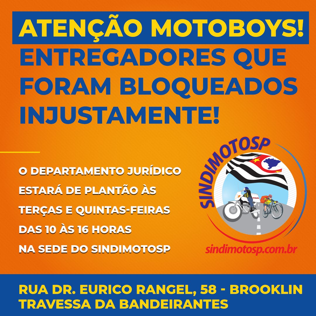 Uma das maiores “manobras” utilizadas pelas empresas de aplicativos para forçar os Motoboys a trabalharem quando elas querem é o bloqueio. Ele é justo quando uma falta é cometida, porém esse recurso é utilizado de maneira indistinta para punir, por exemplo, trabalhadores que não realizam entregas aos finais de semana. Para ser verificado de perto caso a caso, o Departamento Jurídico do SindimotoSP ampliou o atendimento aos Motociclistas. Todas as terças e quintas, das 10 às 16 horas, é só chegar na sede do Sindicato – Rua Dr. Eurico Rangel, 58, Brooklin, São Paulo/SP, e ser atendido.