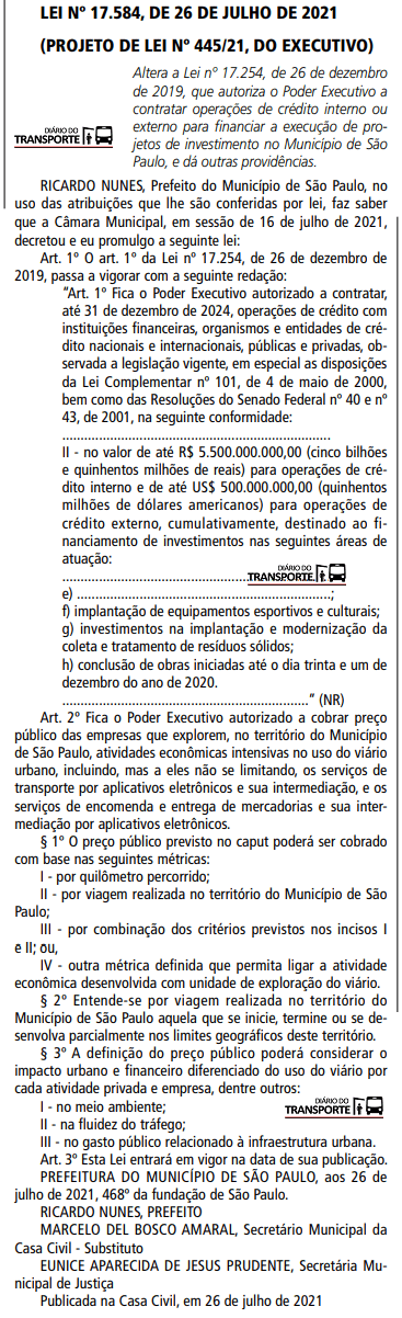O prefeito de São Paulo, Ricardo Nunes, sancionou na segunda (26) a lei que autoriza a Administração Municipal cobrar preço público das empresas exploradoras de atividades econômicas intensivas no uso do viário urbano. O texto original da lei serviu de abrigo para o jabuti dos vereadores Milton Leite e Adilson Amadeu, e na prática permite ao Executivo taxar serviços de transporte por aplicativos como Uber e 99, e serviços de encomenda e entregas de mercadorias intermediados por apps, como iFood e Rappi, dentre outros. O valor da taxa será definido pela Prefeitura de São Paulo.