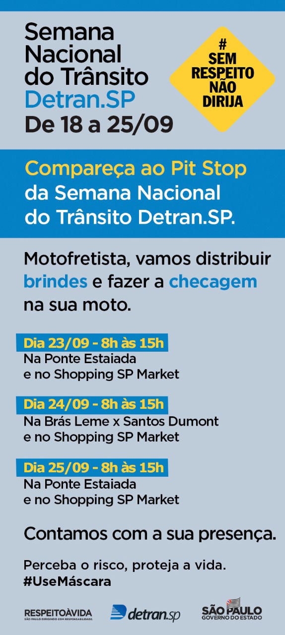 Esta iniciativa faz parte da Semana Nacional do Trânsito realizada pelo DetranSP. Nos locais está ocorrendo o cadastramento de Motofretistas que desejarem fazer o Curso 30 horas do Contran. Serão disponibilizadas 25 mil vagas, sendo 20 mil para o curso online e 5 mil para o curso presencial, ambos gratuitos.