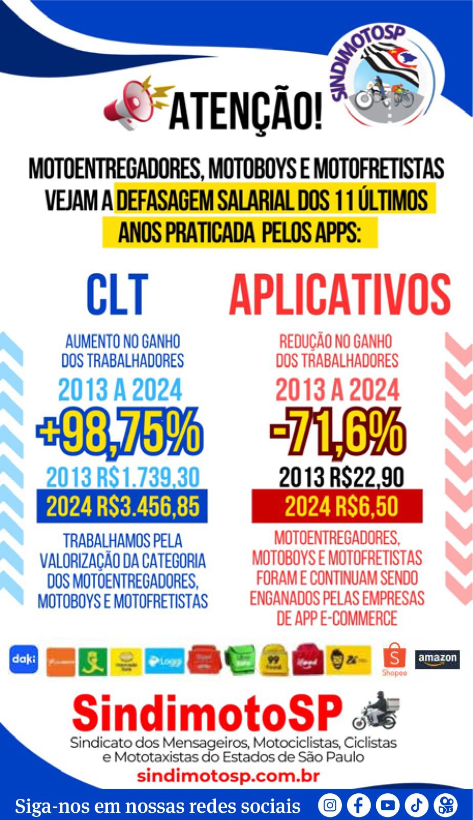 Em contrapartida, trabalhadores registrados em regime CLT e que realizam as mesmas entregas para empresas tradicionais, além de terem remuneração maior, tem jornada de trabalho definida, 13º salário, férias, descanso remunerado, cesta básica, vale refeição, adicional de periculosidade de 30%, aluguel da moto ou bike, seguro de vida, entre outros benefícios.