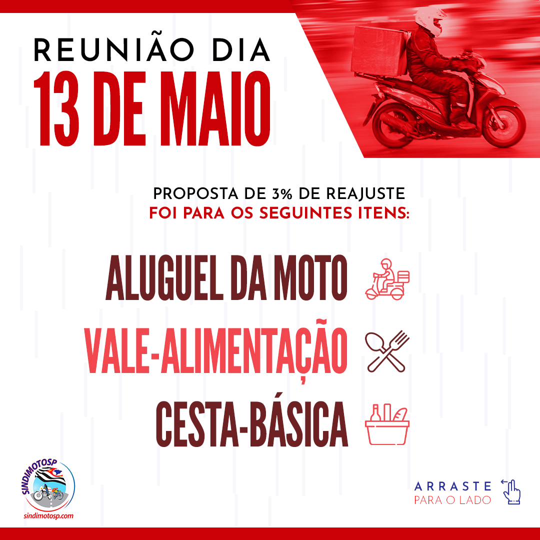 O SindimotoSP, representado pelo seu presidente Gilberto Almeida dos Santos, o Gil, participou de reunião na manhã de hoje (13 de maio) com o representante do Sedersp – sindicato patronal, Fernando Souza. Na ocasião, foi apresentada uma proposta de 3% de reajuste, apenas em cima do aluguel da moto, do vale-alimentação e da cesta-básica. Porém, o Sedersp não quer incidir os 3% no Piso da categoria e no adicional de periculosidade, ALGO COMPLETAMENTE RECHAÇADO PELA NOSSA ENTIDADE SINDICAL.