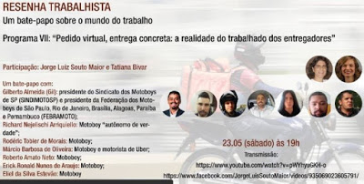 Essas e outras perguntas serão respondidas pelos participantes no programa Resenha Trabalhista, que terá como tema “Pedido virtual, entrega concreta: a realidade do trabalhado dos entregadores” e mediação de Jorge Souto Maior – Professor livre-docente de Direito do Trabalho da Faculdade de Direito da Universidade de São Paulo; coordenador do Grupo de Pesquisa Trabalho e Capital – GPTC; membro da Rede Nacional de Grupos de Pesquisa em Direito do Trabalho e da Seguridade Social – RENAPEDTS; e Juiz do Trabalho titular da 3ª Vara do Trabalho de Jundiaí/SP.