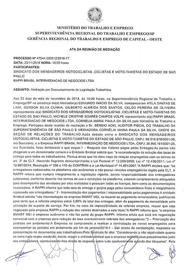 O SindimotoSP reivindicou o reajuste imediato da tarifa repassada ao trabalhador, mostrou também aos representantes do MTE que existe vínculo empregatício entre Rappi e motoboys conforme processos trabalhistas julgados pelo próprio MTE, que há flagrante desrespeito e descumprimento da Rappi em relação as Leis Federais 12.009, 12.436, 12.997, as Resoluções 356 e 410 do Contran, além da Lei Municipal 14491.