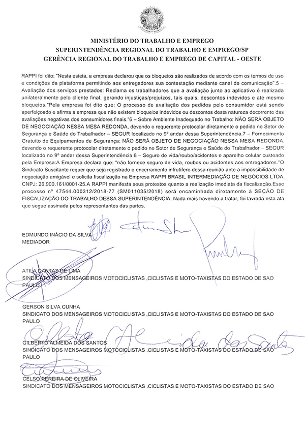 Por fim, o SindimotoSP pede ao MTE que haja uma fiscalização mais efetiva na Rappi pela prática do dumping social e levará a outras seções do Ministério do Trabalho e Emprego – Superintendência Regional do Trabalho – Gerência Regional do Trabalho e Emprego mais demandas do trabalhador motociclista.