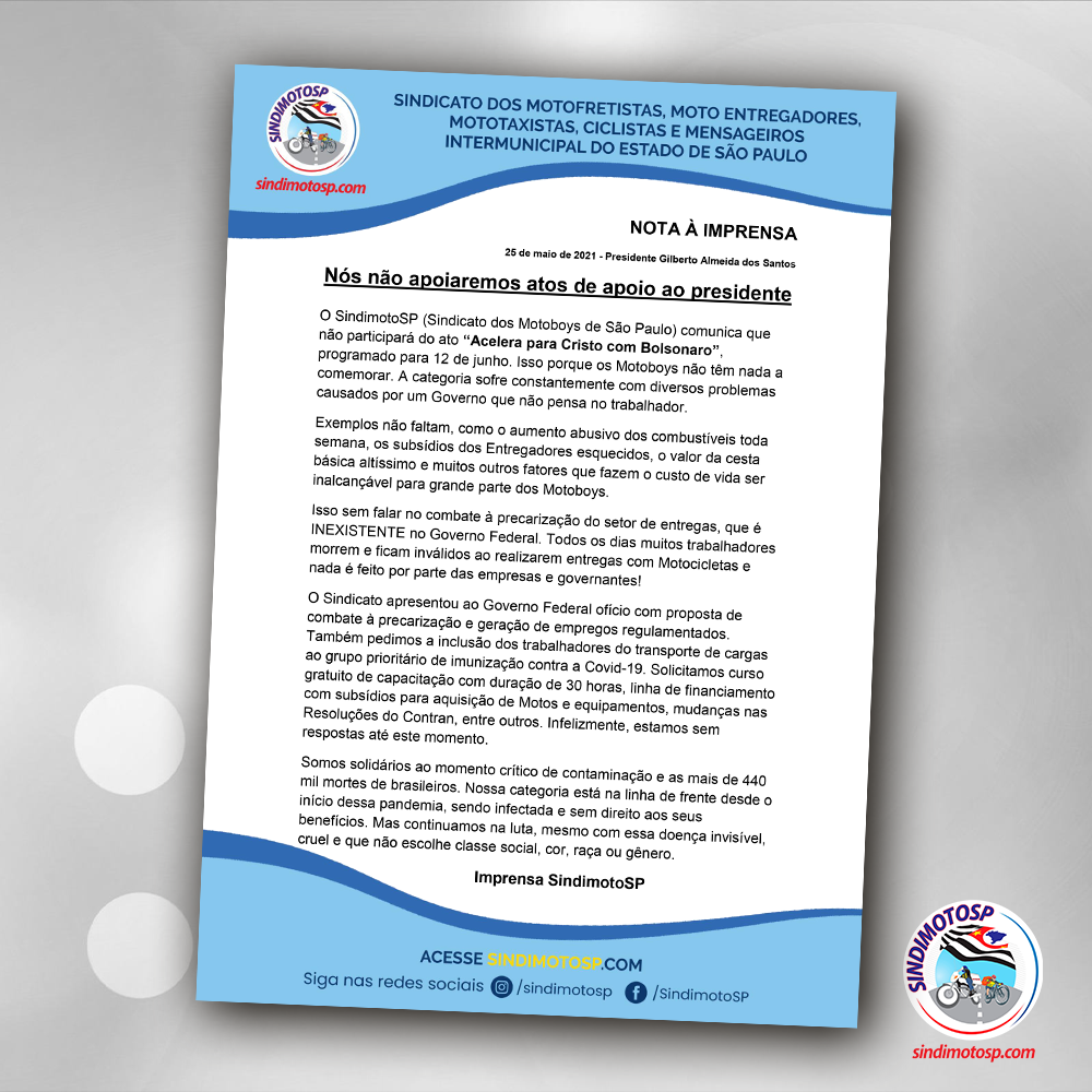O SindimotoSP, após ser acionado por diversos veículos de imprensa, se posiciona publicamente sobre o ato “Acelera para Cristo com Bolsonaro”, programado para 12 de junho. Nós NÃO participaremos deste movimento. E isso, é claro, se deve ao motivo do Motoboy não ter nada a comemorar. A categoria sofre constantemente com diversos problemas causados por um Governo que não pensa no trabalhador. Então, qual a razão de sair de casa, gastar gasolina (já caríssima) em plena pandemia a fim de exaltar um presidente que pouco ou nada faz em prol dos Motociclistas em nosso País.