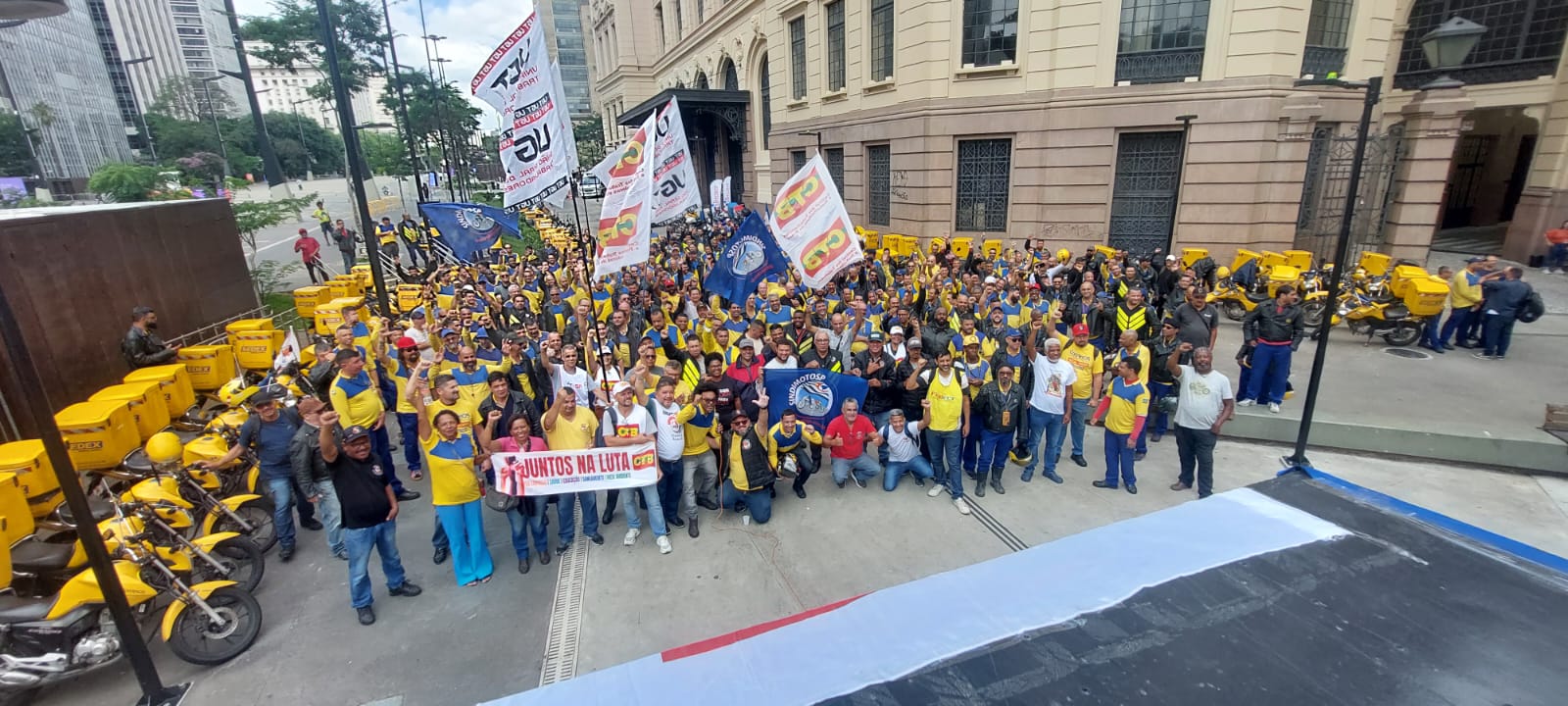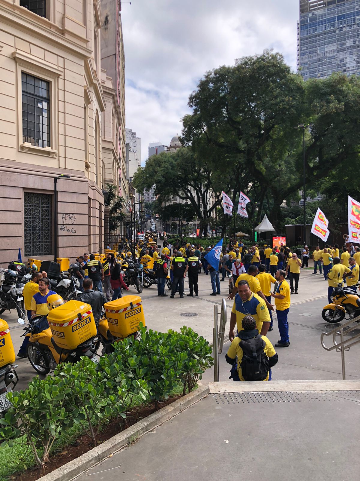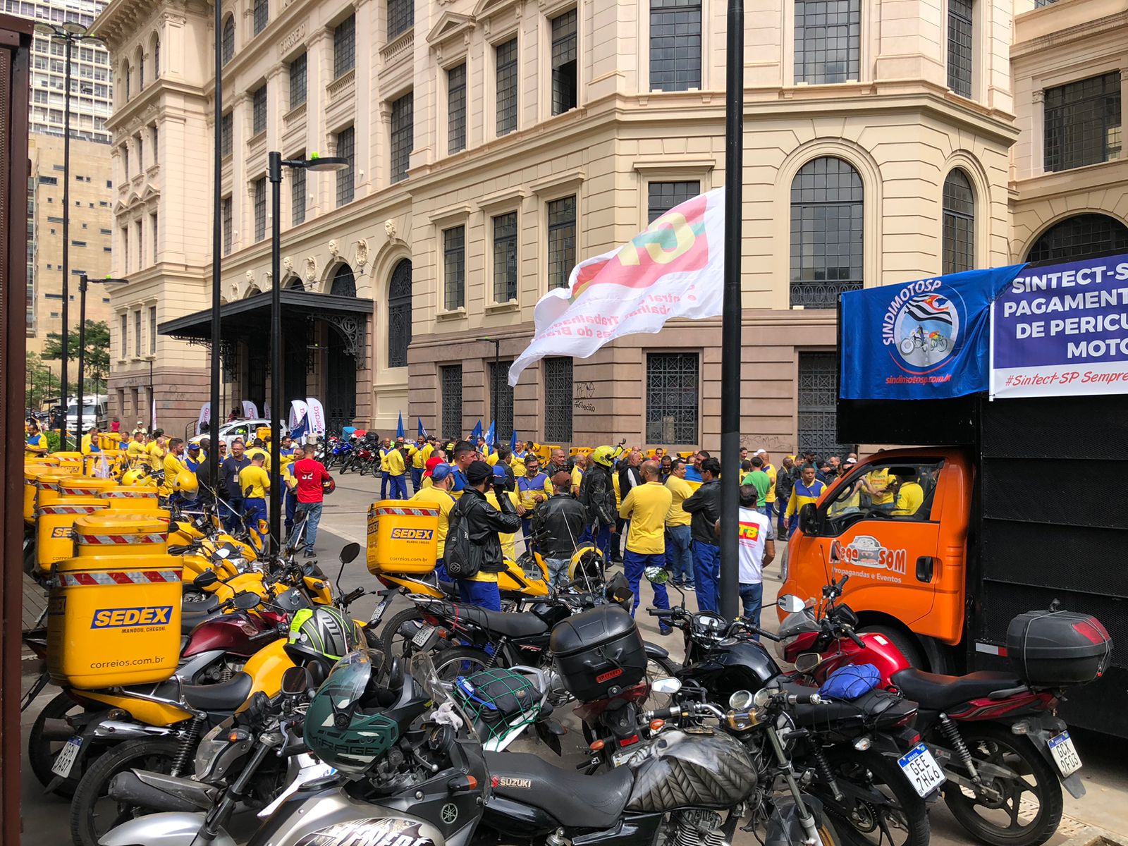 Nessa manhã, o SindimotoSP esteve na sede dos Correios – Centro Histórico de São Paulo, para participar da manifestação organizada pelo Sintect-SP, em defesa da manutenção do direito ao adicional de periculosidade dos motociclistas carteiros, que os Correios quer retirar.