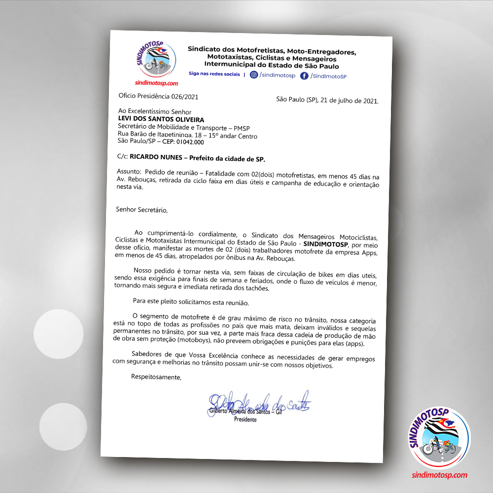 O SindimotoSP protocolou ofício nesta quinta, dia 22 de julho, a fim de solicitar reunião com o secretário de Mobilidade e Transporte Levi dos Santos Oliveira. O assunto em questão é referente a duas fatalidades com motofretistas ocorridas em menos de 45 dias na avenida Rebouças. Já denunciamos diversas vezes que a categoria de motofrete é grau máximo de risco no trânsito e precisa do suporte e colaboração da Administração. Agora, aguardamos uma resposta do secretário.
