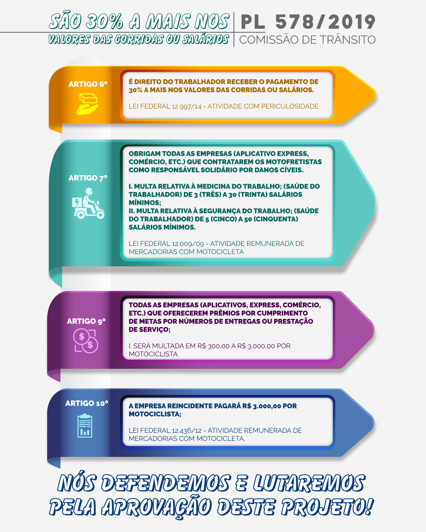 Este projeto realmente fará justiça, ou seja, as empresas de aplicativos terão responsabilidades sobre as contratações que fazem, situação essa que não estava prevista nas leis que regulamentam à categoria. Em setembro de 2019, após reuniões entre o SindimotoSP e a Comissão de Trânsito, Transporte e Atividade Econômica da Câmara de Vereadores de São Paulo, foi criado o Projeto de Lei nº 578/2019 que realmente atende às demandas da categoria e dará um novo rumo a situação do motofrete na Capital paulista. O PL regulamenta a Lei Federal nº 12.009, nº 12.436, nº 12.997 e atualiza a Lei Municipal nº 14.491.